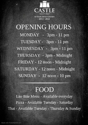 Also on an evening we will be serving traditional hand stretched wood fired pizzas from local Bedford restauranteurs Pizzeria Santaniello who will deliver authentic Italian cuisine to your table at the Castle, while you enjoy a relaxing drink in a traditional pub. As well as authentic Thai Food from local restauranteurs Rice Thai.